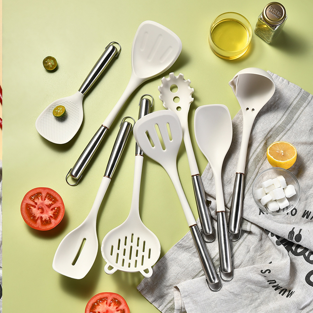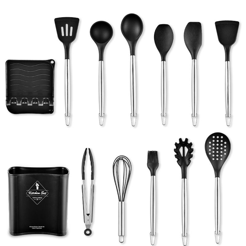 Versatile Tools: Includes a Western-style spatula, slotted turner, soup ladle, skimmer, small slotted spoon, salad spoon, spaghetti server, scraper, 12-inch silicone stainless steel food tongs, oil brush, and whisk.
